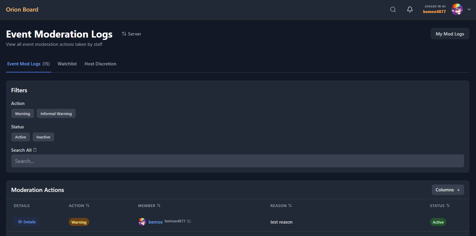 All event moderation actions are now recorded in Orion Board. The GitHub Warning Book (project 4) has been replaced.