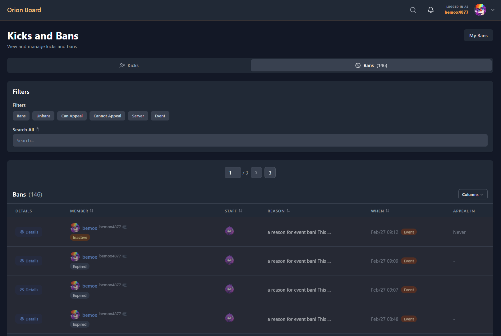 Kicks and bans are viewed and managed on the Kicks and Bans page in Orion Board.